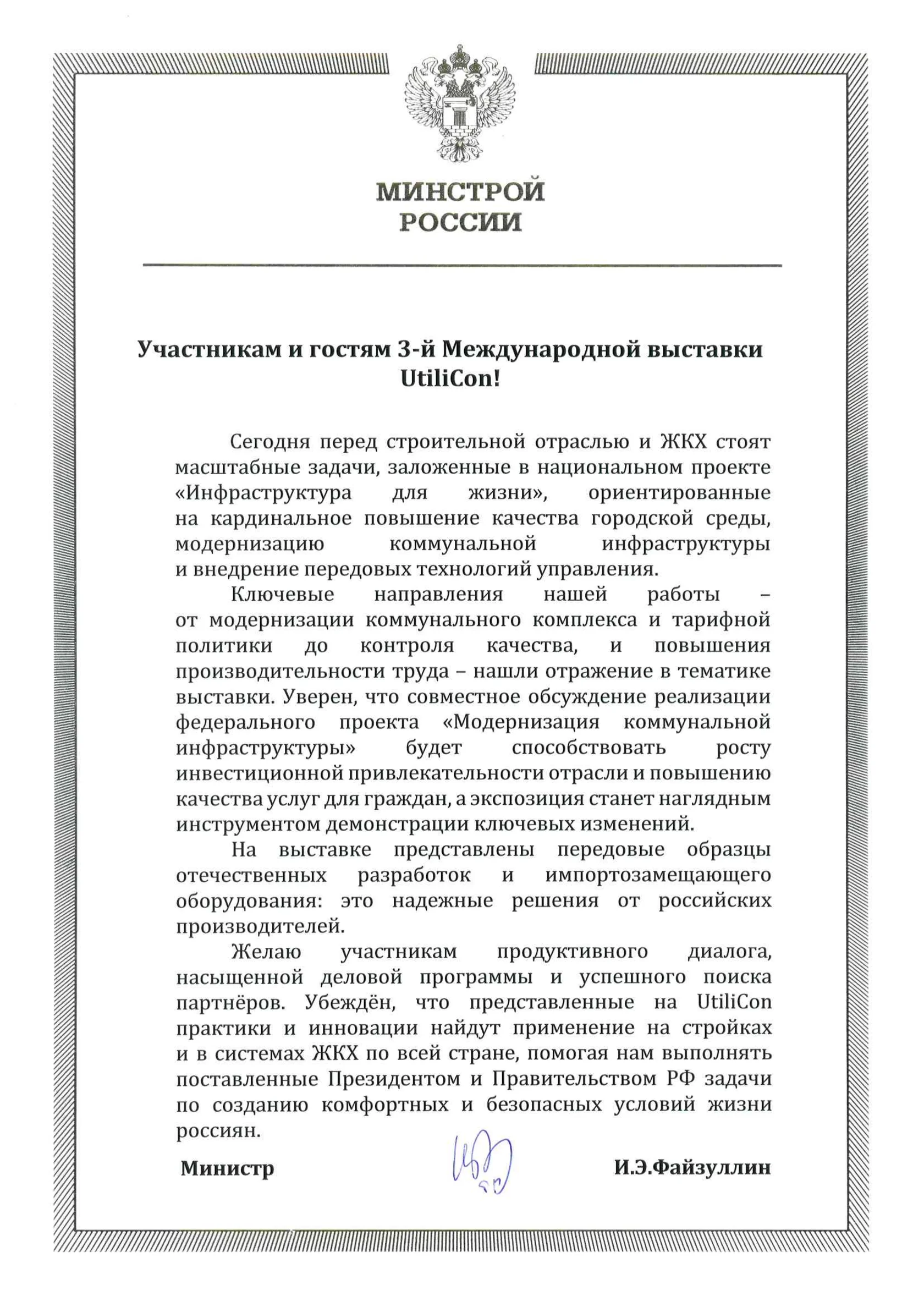 Приветствие Министра строительства и жилищно-коммунального хозяйства РФ Ирека Энваровича Файзуллина